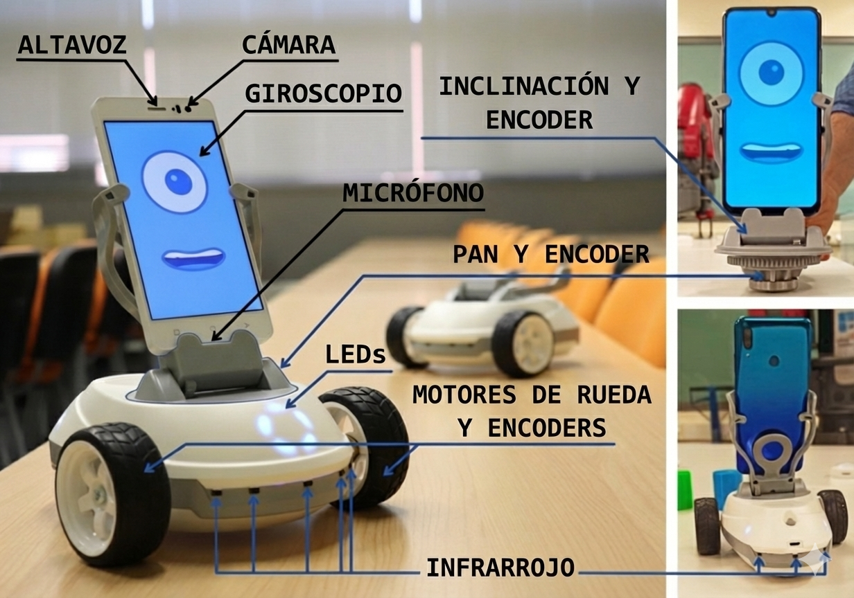 Robobo consta de una base móvil a la que se le acopla un Smartphone con el que se conecta de forma inalámbrica. La base es el cuerpo, el esqueleto y el músculo de Robobo, mientras que el smartphone es su cerebro, y también sus sentidos (vista, oído, tacto).