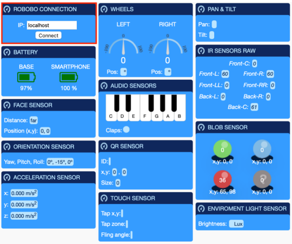 Mientras se están creando programas con Robobo, puede ser necesario conocer el valor de los sensores de cara a establecer umbrales o valores de referencia. Por este motivo, Robobo incluye una ventana de monitorización web, que es altamente recomendable tener abierta.