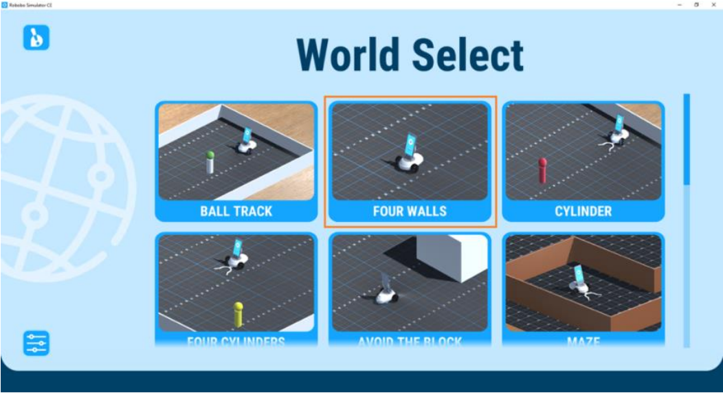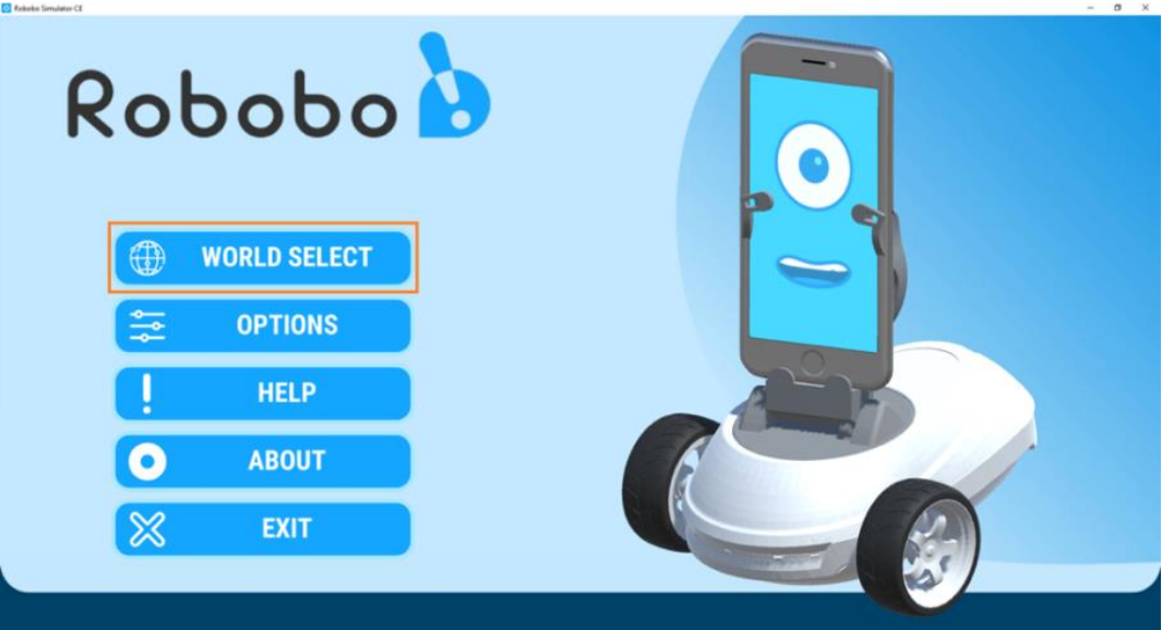 Una vez instalada la aplicación, podemos comprobar su correcto funcionamiento en RoboboSim mediante la ejecución de un programa de ejemplo simple. Antes de nada, se debe ejecutar el simulador, y en la pantalla inicial, se accede a la selección de mundos a través del botón “World select”.
