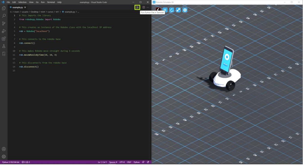 Todos los programas que se desarrollen en Python para programar al robot Robobo tienen una primera parte inicial común: importar la librería robobopy y realizar la conexión con el robot real o con el simulador.