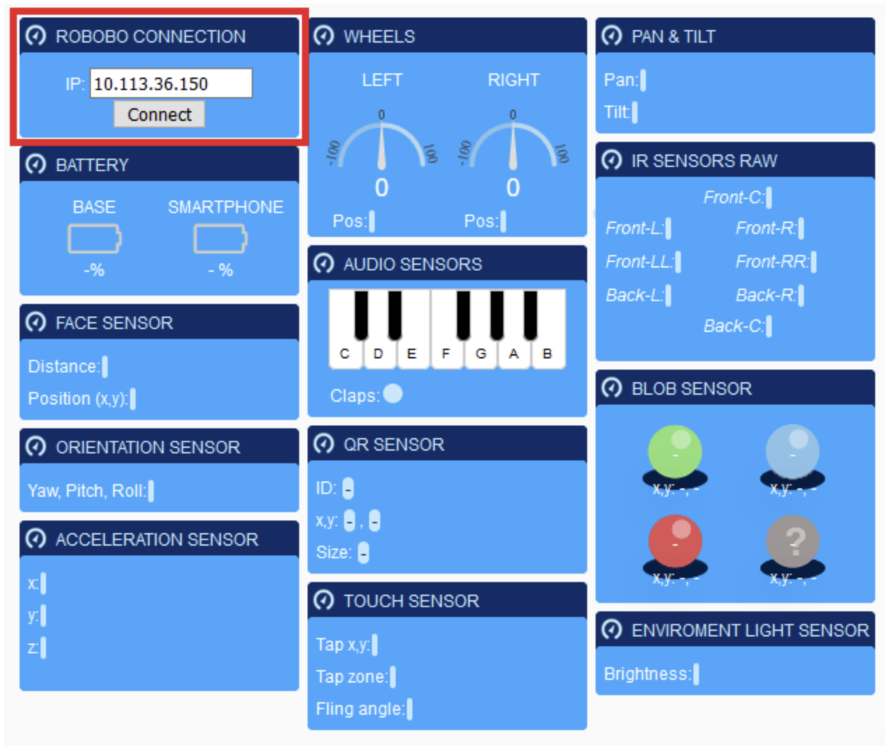 En la página que se abre, debemos escribir, en la parte superior izquierda, la dirección IP del robot real o bien localhost si estamos usando RoboboSim, y pulsar el botón Connect.