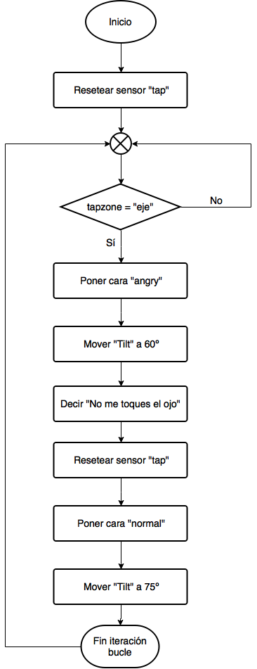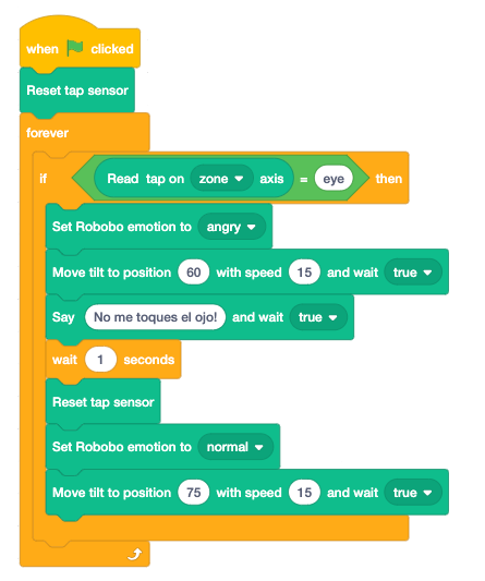 Si le tocas el ojo (tap), Robobo echará la cabeza hacia atrás para escapar de tu mano. Al mismo tiempo, pondrá cara de enfado y te dirá que no le toques el ojo.