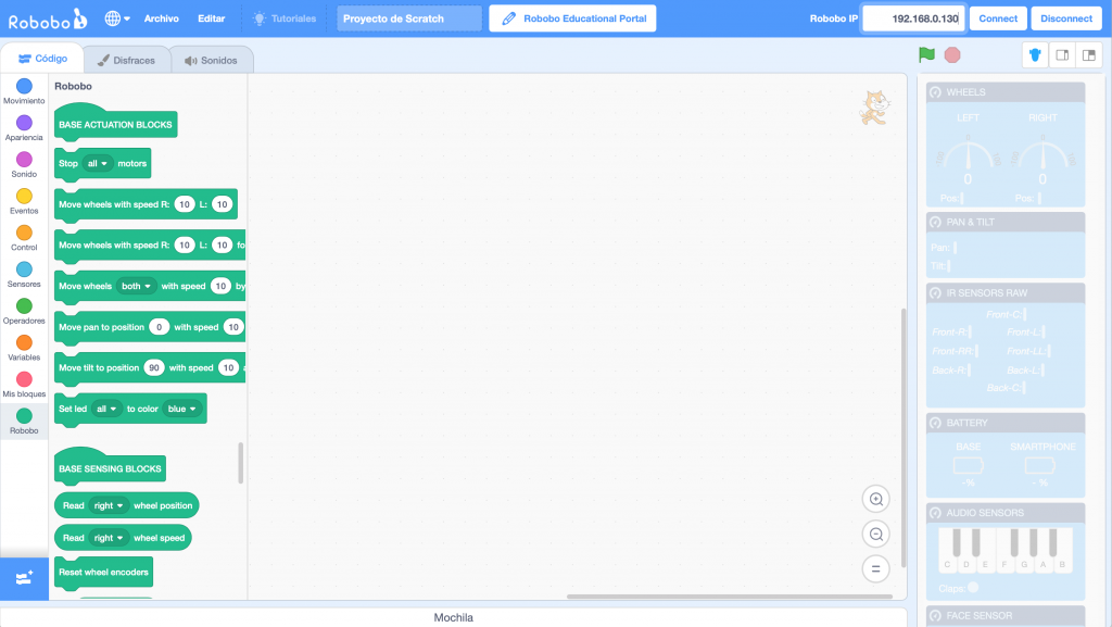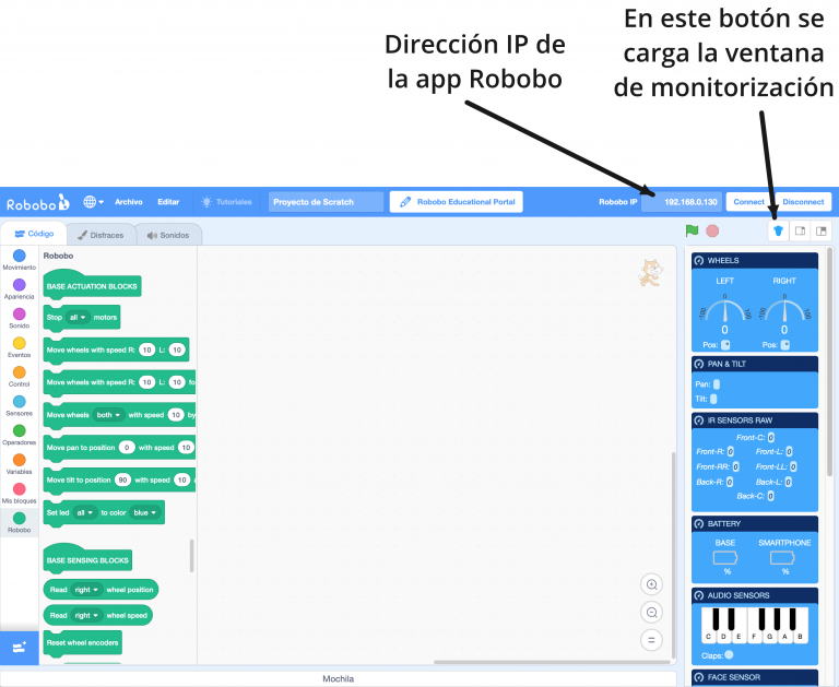 Finalmente, en la parte derecha de la barra está el cuadro donde se introduce la IP del smartphone de Robobo, y los botones de conexión y desconexión. Tal y como se explica en la sección de configuranción general, para comenzar a programar con Robobo, debemos introducir en el campo «Robobo IP», la dirección IP que se muestra en el menú inicial de la app Robobo del smartphone, y a continuación hacer click sobre el botón «Connect». Para desconectar el ordenador de Robobo, pulsaremos en el botón «Disconnect».