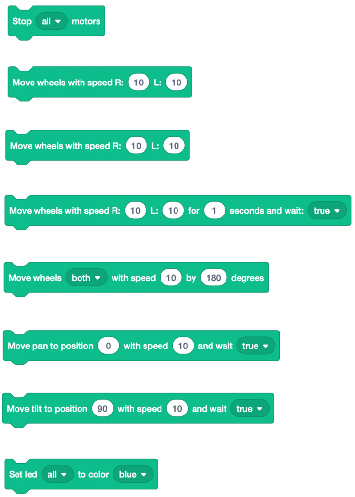 La funcionalidad de estos bloques se explica en las distintas secciones de este manual a las que se accede desde el menú de la izquierda, siendo su uso el típico de cualquier bloque Scratch, de modo que deben ser arrastrados al área de programación (zona central de la ventana) y ejecutados como cualquier otro bloque.