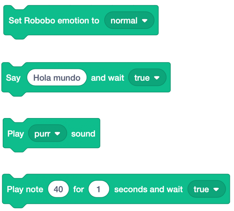 Los bloques propios de Robobo están organizados en 4 grandes tipos, separados por un bloque en letras mayúsculas: