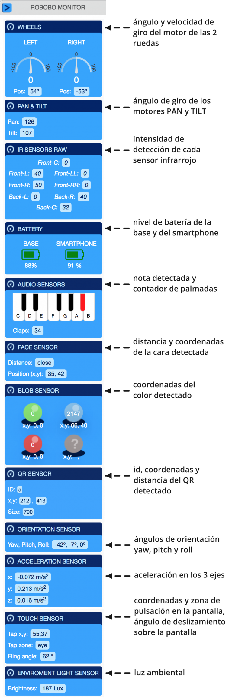 En concreto, esta ventana muestra los siguientes sensores Robobo, que se corresponden con los que se pueden leer utilizando los bloques Robobo explicados en este manual. El rango de cada sensor se debe consultar en el apartado correspondiente a cada sensor: